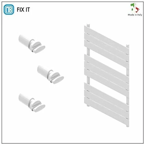 Ensemble de 3 fixations STP pour radiateur de salle de bain avec tube plat, à réglage horizontal, idéal pour les murs standard et en plaques de plâtre. Utilisez des vis et des chevilles appropriées. Réglage: de 66 à 88 mm. Capacité maximale 30 kg par support, 90 kg au total. Idéal pour tous les types de sèche-serviettes et porte-serviettes chauffants avec des tubes plats de 10 mm de section et une distance minimale de 5 mm entre les tubes. De couleur blanche.