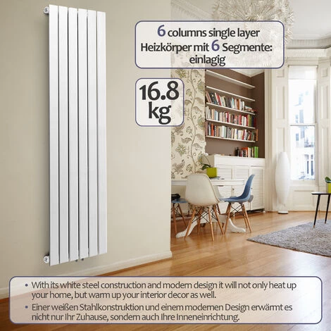 Ce radiateur vertical contemporain, en plus de son aspect élégant, offre des performances impressionnantes. Grâce à sa construction en acier blanc et son design moderne, à part du chauffage de votre maison (796W), notre radiateur la rend également plus accueillante.