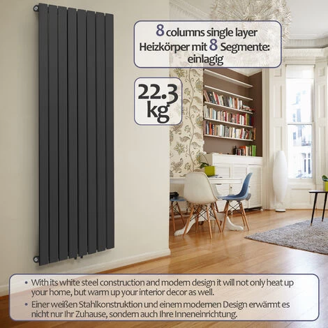 Ce radiateur vertical contemporain, en plus de son aspect élégant, offre des performances impressionnantes. Grâce à sa construction en acier anthracite et son design moderne, à part du chauffage de votre maison (1062W), notre radiateur la rend également plus accueillante.