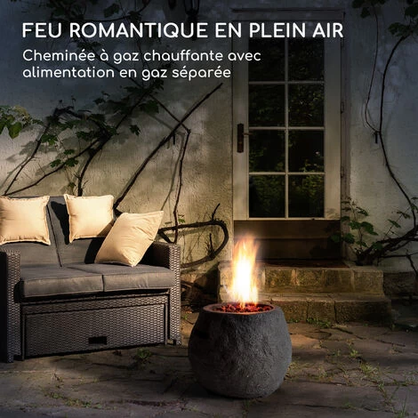 Foyer à gaz performant pour le romantisme et la chaleur naturelle dans les oasis de plein air : le foyer à gaz Andros de blumfeldt allie beauté rustique et fonctionnalité confortable.