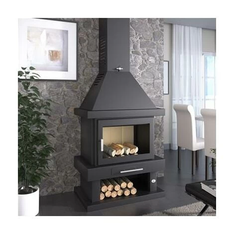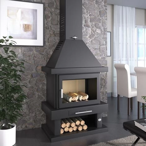 Fabriqué en acier de 4mm, double hotte, foyer en vermiculite, porte avec cordon céramique, porte et grille en fonte, clapet, peinture résistante jusqu’à 800ºC, verre résistant jusqu’à 750ºC, sortie des fumées supérieur de 250mm, cendrier amovible, réglage d’air primaire et secondaire, système vitre propre, double combustion, bûcher inférieur
