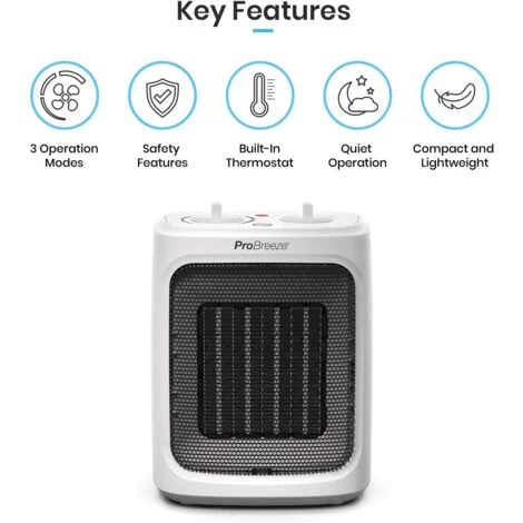 Pro Breeze Mini Radiateur Soufflant Céramique 2000W, avec 2 Réglages de Température et Protection contre la surchauffe