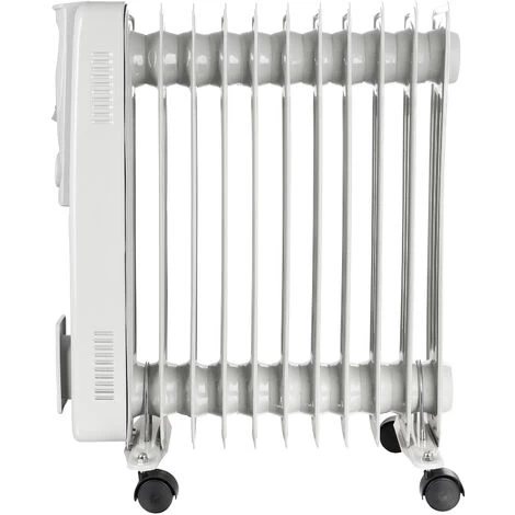 - THERMO-OLIE: la différence avec un chauffage central se situe à l’intérieur. Au lieu de l’eau, il y a de la thermo-huile à l’intérieur d’un radiateur à huile. Lorsque vous allumez le radiateur, l’huile est chauffée et émet de la chaleur. Grâce à sa conception avec 11 ailettes séparées, le chauffage chauffe très efficacement avec une puissance de 2 500 watts.
