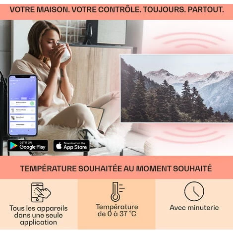 APP SMARTPHONE POUR CONTRÔLER VOTRE APPAREIL : L’application permet de régler la température souhaitée depuis votre téléphone où que vous soyez via WiFI. Vous pouvez programmer un ou plusieurs chauffages pour qu’ils s’allument à une certaines heures.